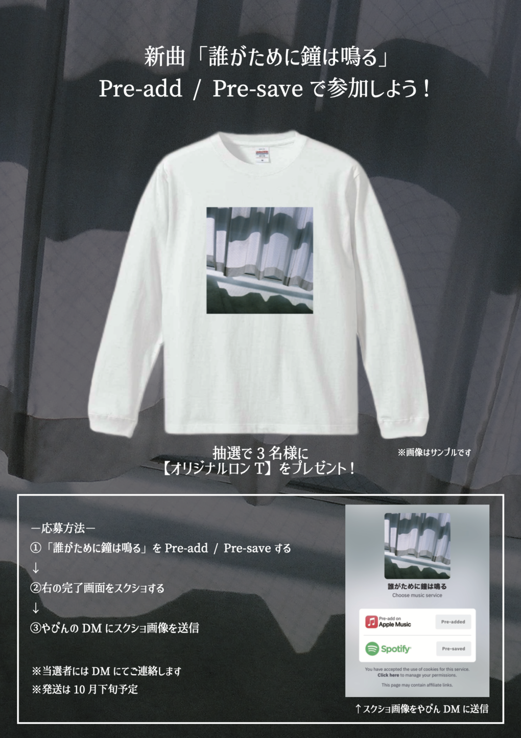 「誰がために鐘は鳴る」 リリース前に、Apple MusicかSpotifyの Pre-add / Pre-save機能を使って事前予約しよう! 応募完了画面をYup'inにDMすると 抽選3名様にオリジナルロンTがあたる! 応募期間は10/7まで。 ※沢山のご応募ありがとうございました。